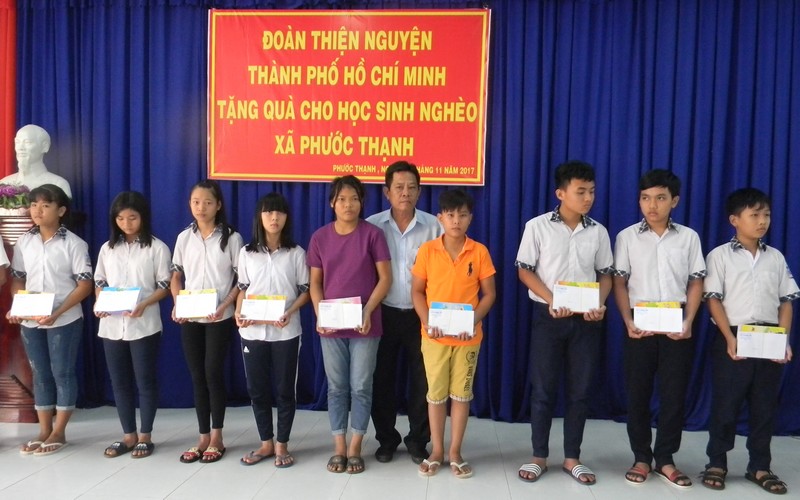 Tặng quà cho học sinh nghèo xã Phước Thạnh. |