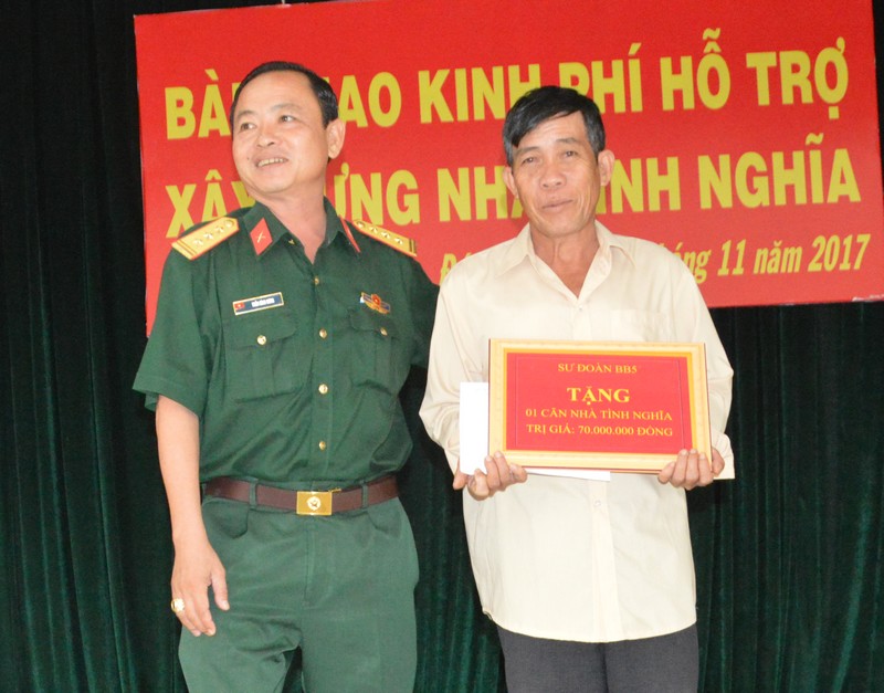 Đại diện Sư đoàn 5 trao kinh phí hỗ trợ xây nhà tình nghĩa cho CCB Nguyễn Văn Tám. |