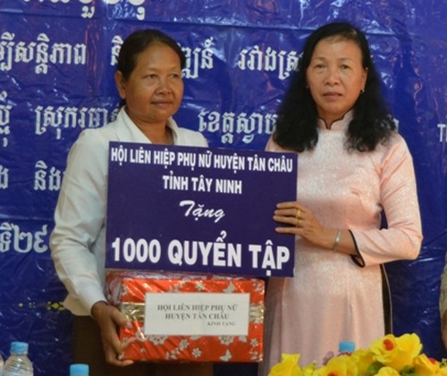 | Bà Nguyễn Thị Thanh Bình- Chủ tịch Hội LHPN Tân Châu tặng quà cho Hội Phụ nữ Campuchia Vì hòa bình và phát triển huyện Memot. |