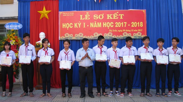 | Ban Giám hiệu Trường THCS thị trấn Tân Biên trao thưởng cho học sinh. |