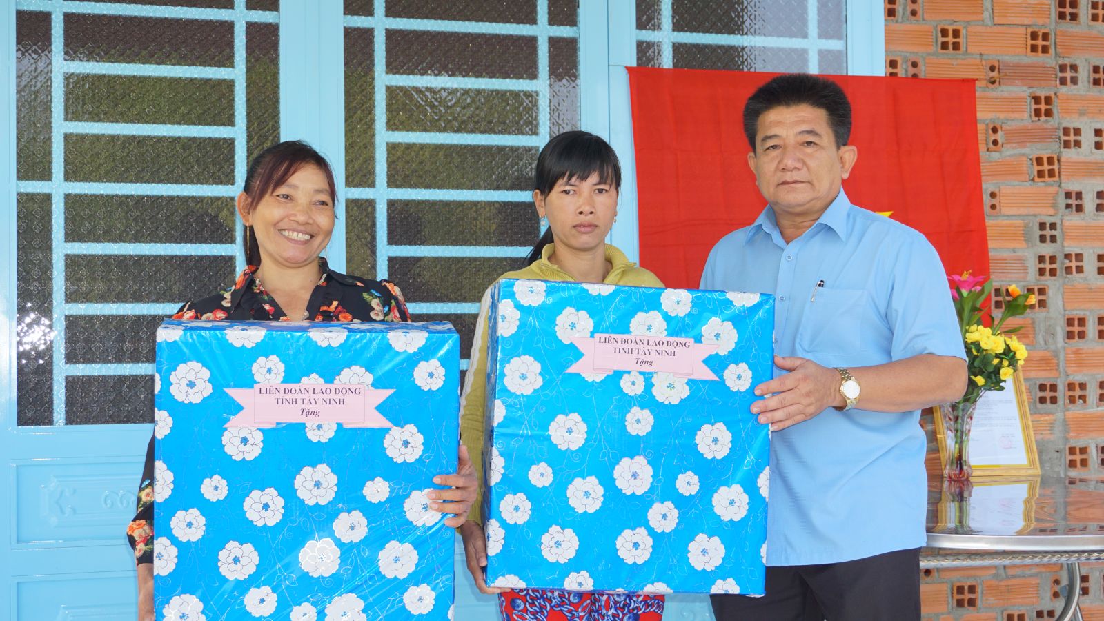Ông Võ Văn Dũng- Chủ tịch LĐLĐ tỉnh tặng quà chúc mừng gia đình chị Hằng và chị Thương. |