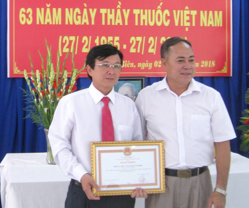| Ông Nguyễn Văn Hồng- Chủ tịch HĐND huyện Tân Biên trao bằng khen của UBND tỉnh cho tập thể TTYT Tân Biên tại lễ kỷ niệm ngày Thầy thuốc Việt Nam 27.2 |