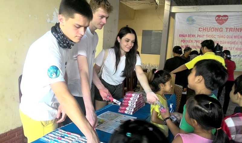 Những chàng trai, cô gái người Pháp tặng quà cho các em nhỏ tại buổi khám bệnh. |