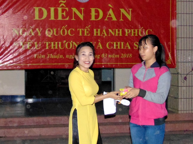 Tặng quà cho đoàn viên xã Tiên Thuận tham gia hái hoa dân chủ. |