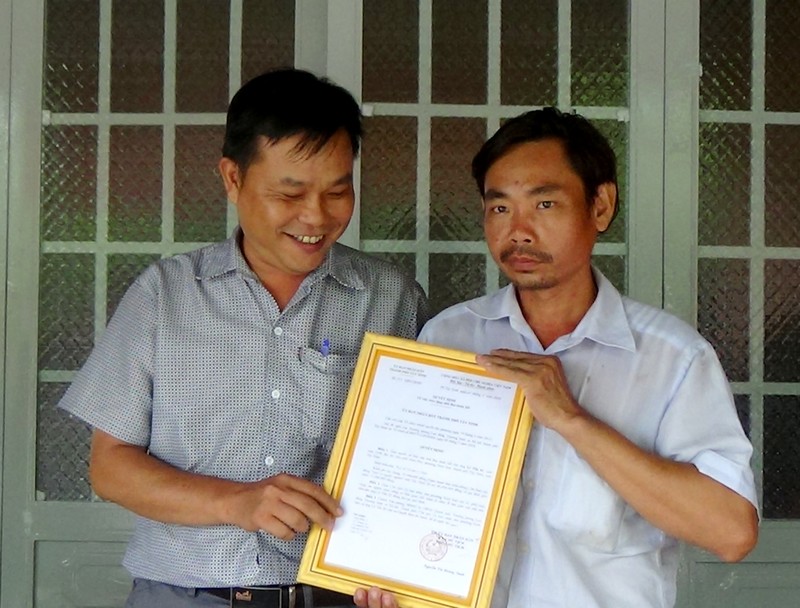 Anh Lê Tấn Sỹ (phải) nhận quyết định bàn giao nhà. |