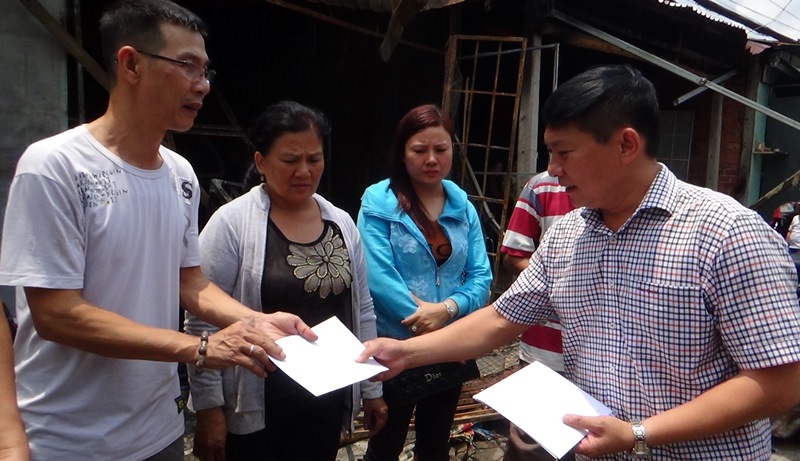 Ông Phạm Trung Chánh – Chủ tịch UBND Thành phố Tây Ninh trao tiền hỗ trợ cho các hộ dân có nhà bị cháy.