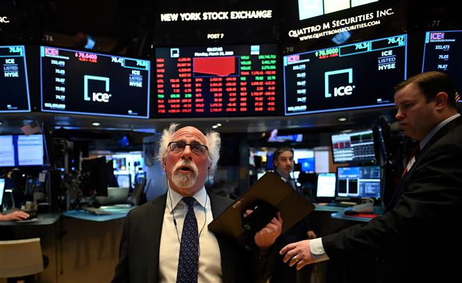 Giao dịch viên theo dõi chỉ số chứng khoán tại sàn giao dịch New York, Mỹ ngày 16/3/2020. Ảnh: AFP/TTXVN
