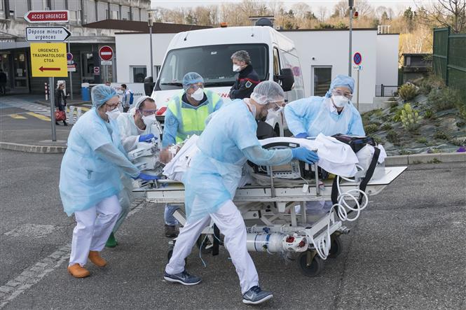 Nhân viên y tế chuyển bệnh nhân nhiễm COVID-19 tại Mulhouse, Pháp, ngày 17/3/2020. Ảnh: AFP/ TTXVN