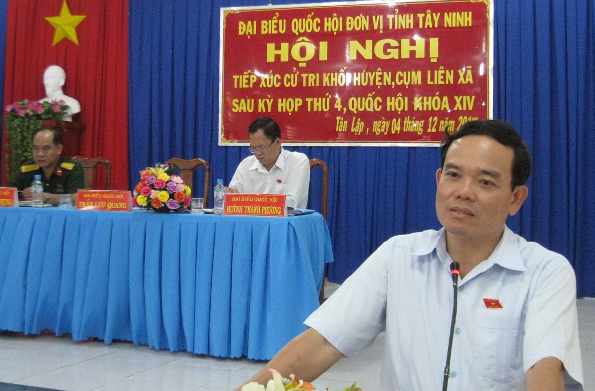 * Sáng 5.12, tại Trung tâm Văn hóa xã Long Thành Trung (Hòa Thành), các đại biểu Quốc hội đơn vị tỉnh Tây Ninh gồm ông Trần Lưu Quang- Bí thư Tỉnh ủy, Trưởng đoàn ĐBQH đơn vị tỉnh Tây Ninh, ông Huỳnh Thanh Phương - Phó trưởng đoàn ĐBQH tỉnh và đại tá Hoàng Đình Chung - Chính ủy Bộ CHQS tỉnh đã có buổi tiếp xúc với gần 200 cử tri là đại diện các phòng, ban, lực lượng vũ trang, doanh nghiệp của cấp huyện và cụm liên xã Long Thành Nam, Long Thành Trung, Long Thành Bắc và Hiệp Tân.