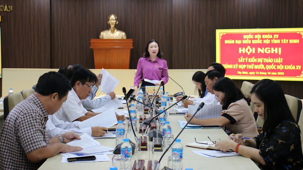 Sáng 13/10, Đoàn đại biểu Quốc hội (ĐBQH) tỉnh Tây Ninh tổ chức Hội nghị đóng góp ý kiến đối với các dự án Luật trình Quốc hội thông qua tại Kỳ họp thứ 10, Quốc hội khóa XV. Phó Trưởng đoàn chuyên trách Đoàn ĐBQH tỉnh Tây Ninh Lê Thị Song An chủ trì hội nghị.