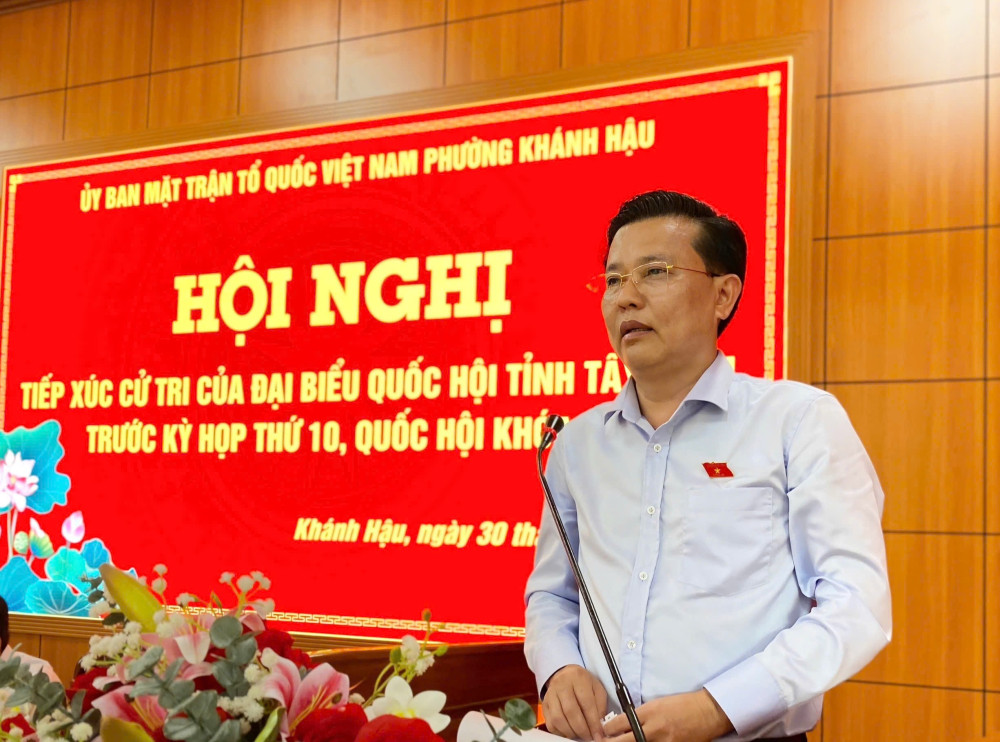 Tại buổi tiếp xúc, cử tri phường Khánh Hậu có ý kiến về việc chi trả hỗ trợ và lương hưu sau khi thực hiện chính quyền địa phương hai cấp; rút ngắn thời gian định giá đất để phù hợp tình hình thực tế; nhiều tuyến đường xuống cấp, thiếu biển báo giao thông, đèn chiếu sáng, gây mất an toàn giao thông; việc đóng thuế qua ứng dụng còn gặp lỗi, cần nâng cấp để thuận tiện hơn.
