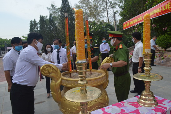 Trong không khí trang nghiêm của buổi lễ, các đại biểu đã dành một phút mặc niệm, kính cẩn dâng tràng hoa mang dòng chữ “Đời đời ghi nhớ công ơn các anh hùng, liệt sĩ” tại đài tưởng niệm và thắp hương lên phần mộ các anh hùng, liệt sĩ.