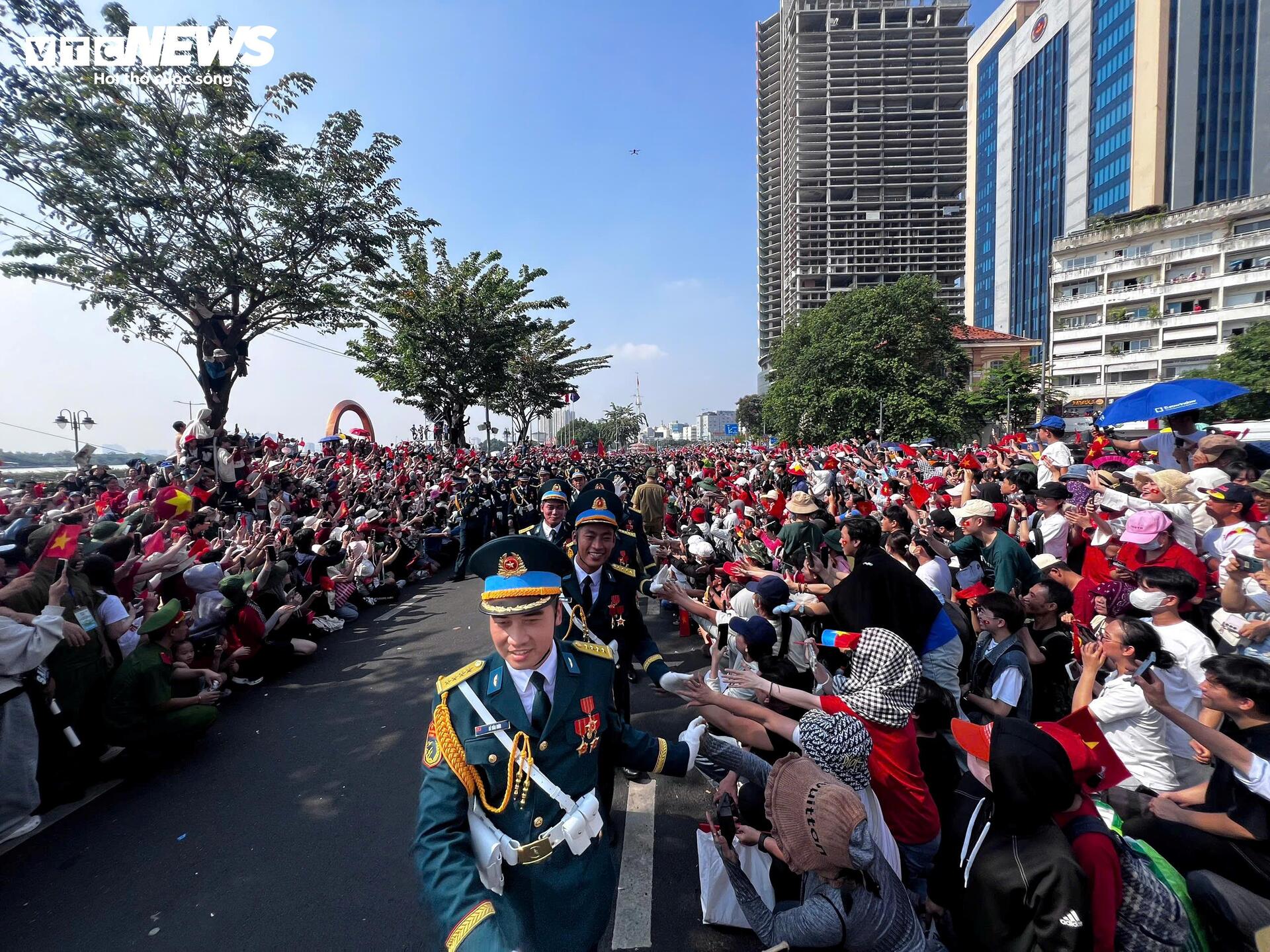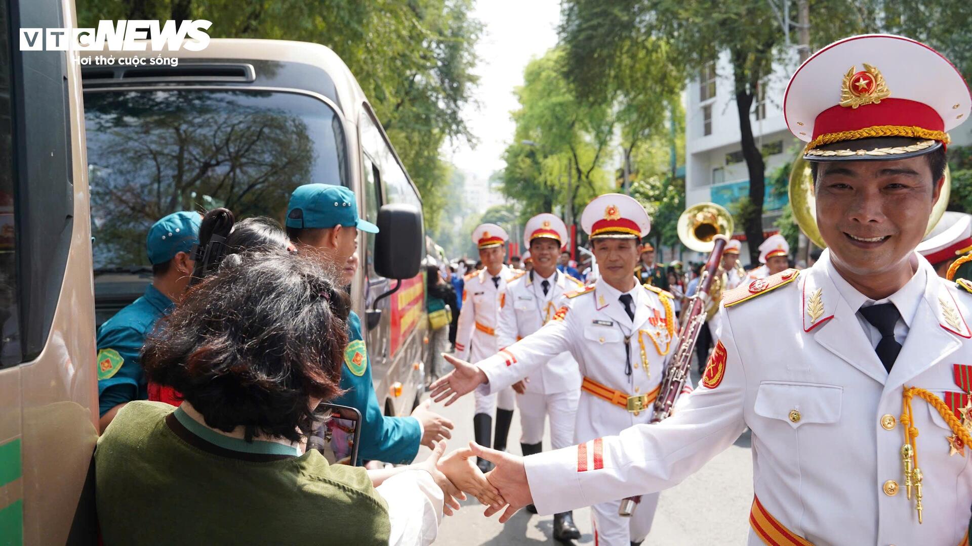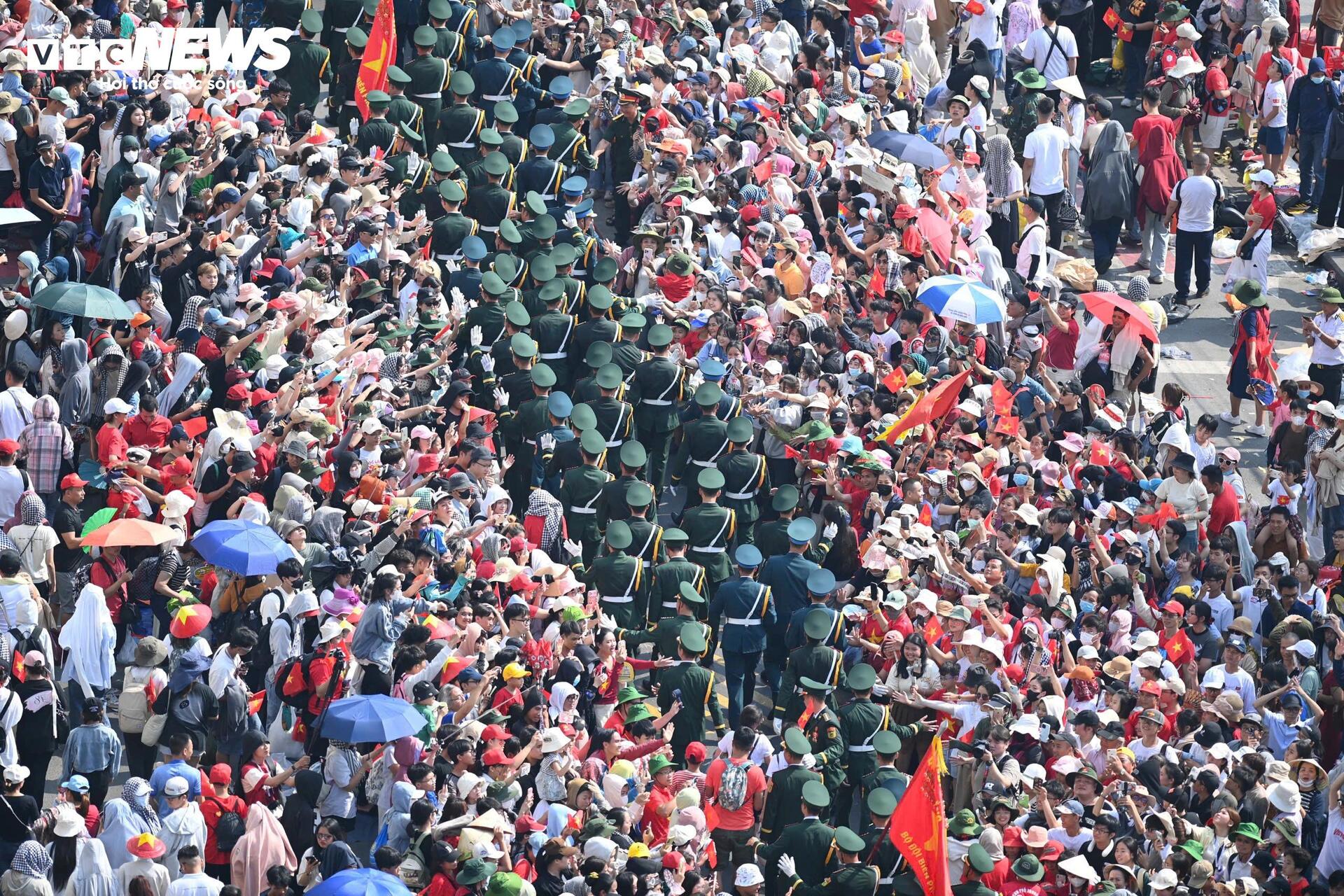 Các chiến sĩ được người dân reo hò, bắt tay, chúc mừng sau khi hoàn thành nhiệm vụ tại lễ diễu binh, diễu hành.