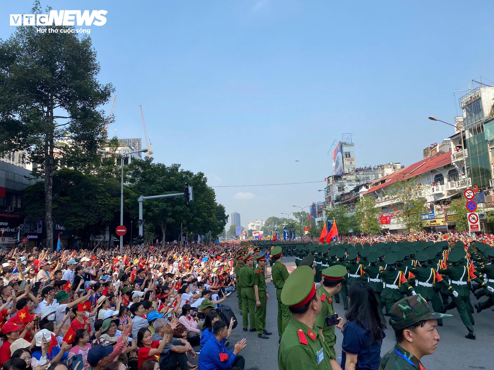 "Khi các đoàn bước tới, người dân không ai nói ai đồng loạt reo hò, hát vang, thực sự rất tự hào và ý nghĩa. Những bước chân uy nghiêm, hùng tráng, khiến cho mỗi người đều có cảm xúc rất khó tả. Chỉ biết thấy yêu Tổ quốc, yêu đất nước hơn, tự hào hơn và phải cống hiến nhiều hơn nữa", chị Hương nói. (Ảnh: Lương Ý)