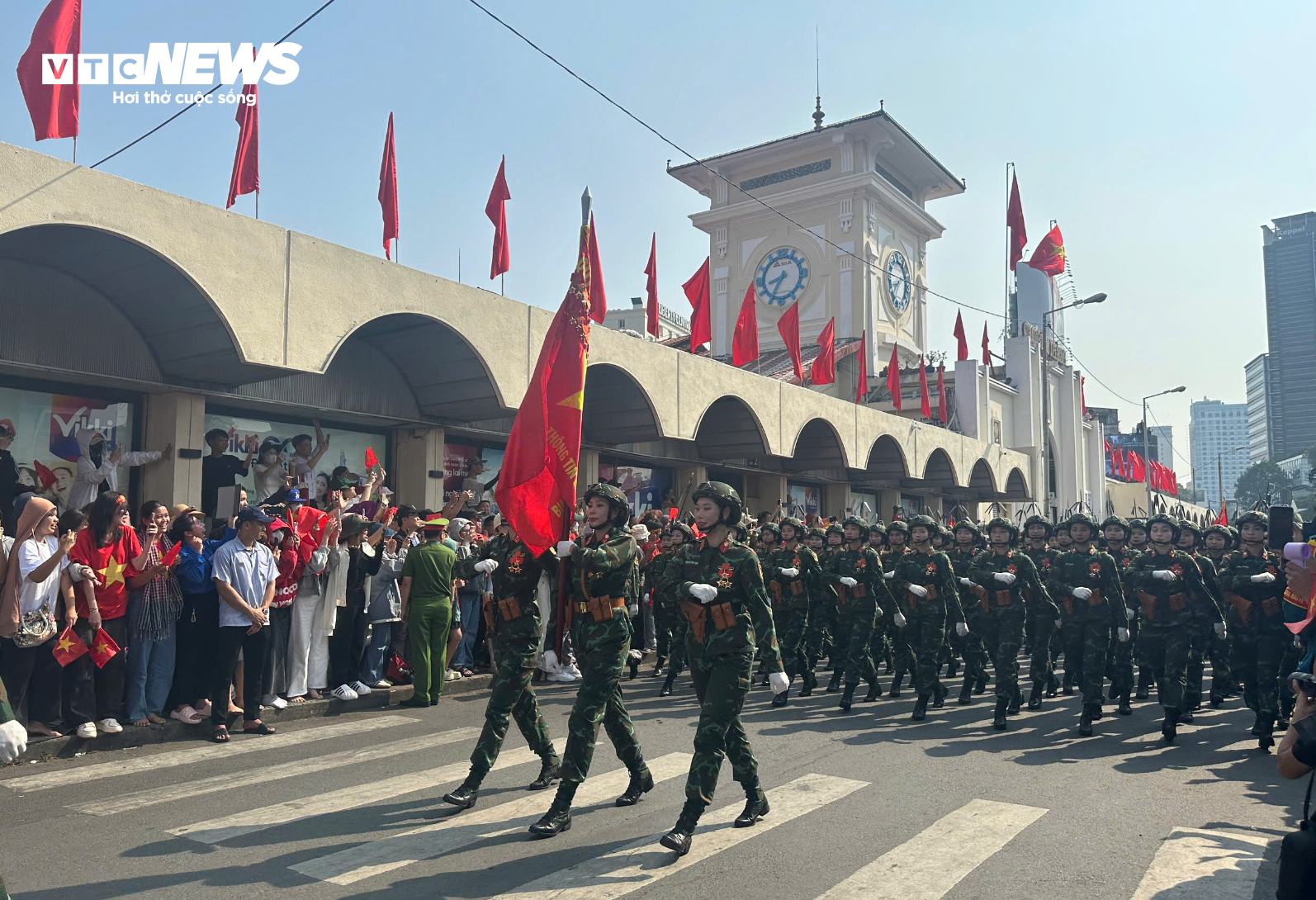 Đoàn diễu binh đi qua khu vực chợ Bến Thành.