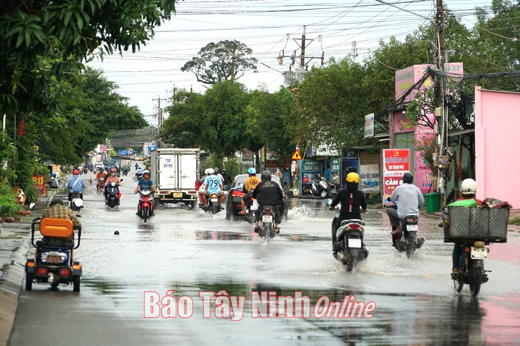 Sau cơn mưa chiều 23.10, đường Tua Hai, đoạn ngang địa bàn khu phố 3, phường 1, TP. Tây Ninh bị ngập nước cục bộ.