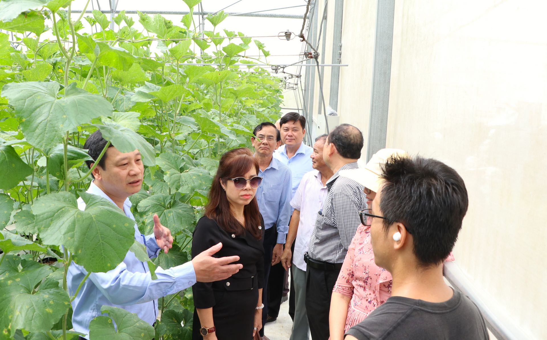 Đoàn đi thực tế mô hình trồng dưa lưới trong nhà kính của anh Phạm Hồng Khánh ngụ ấp Trường Phú, xã Trường Đông.