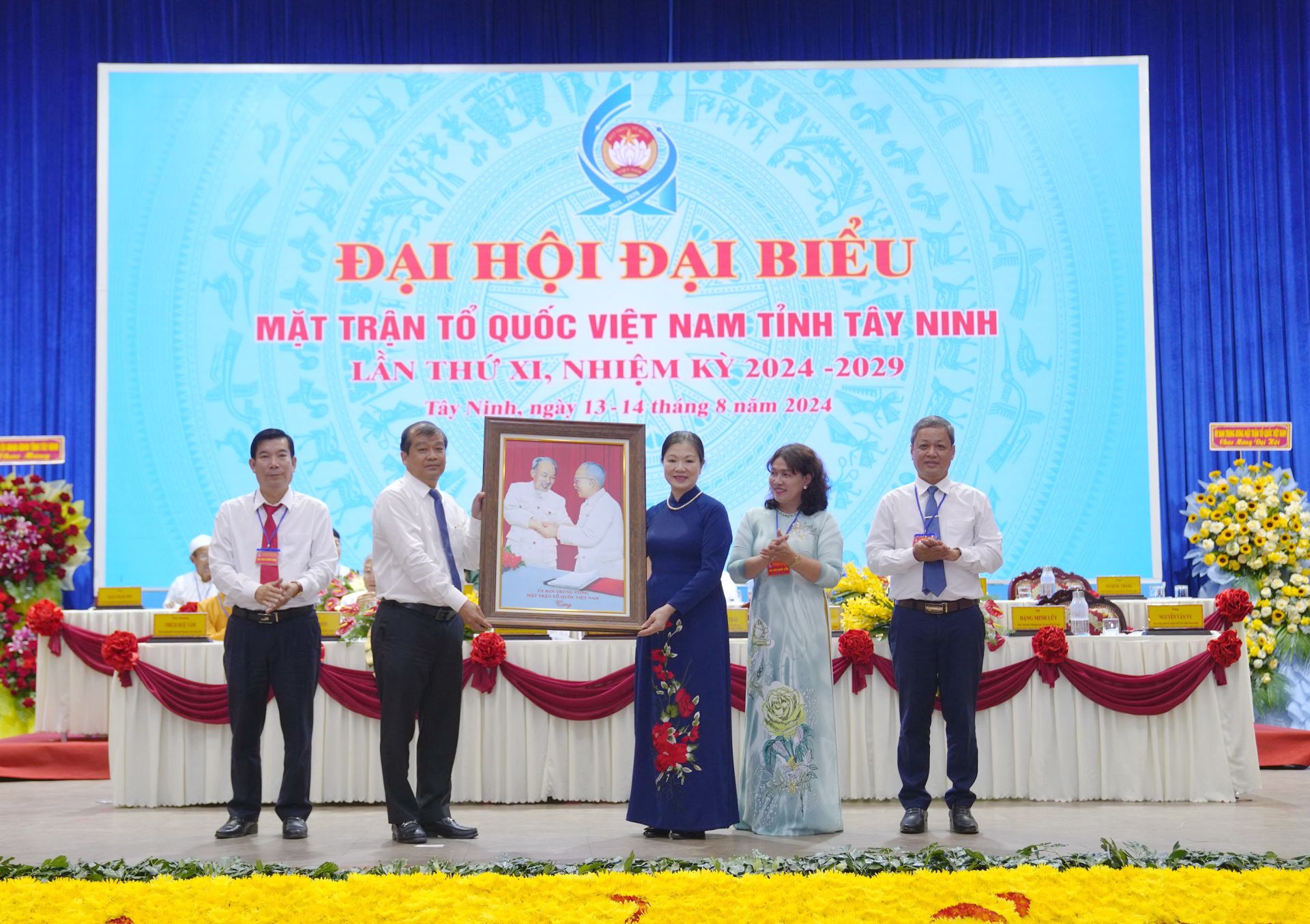 Bà Trương Thị Ngọc Ánh- Phó Chủ tịch Uỷ ban Trung ương MTTQ Việt Nam tặng bức ảnh Bác Hồ cho Uỷ ban MTTQ Việt Nam tỉnh.
