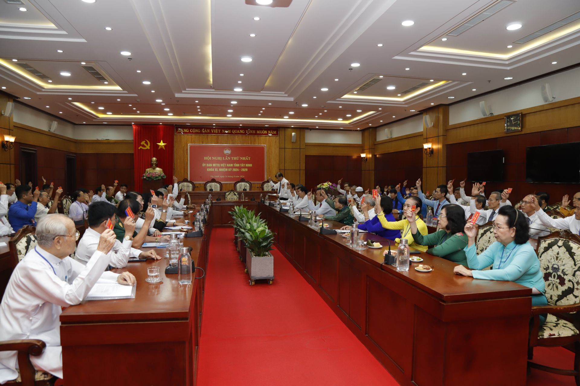 Các đại biểu dự hội nghị lần thứ nhất Ủy ban MTTQ Việt Nam tỉnh khóa XI biểu quyết bầu ông Võ Đức Trong làm Chủ tịch.