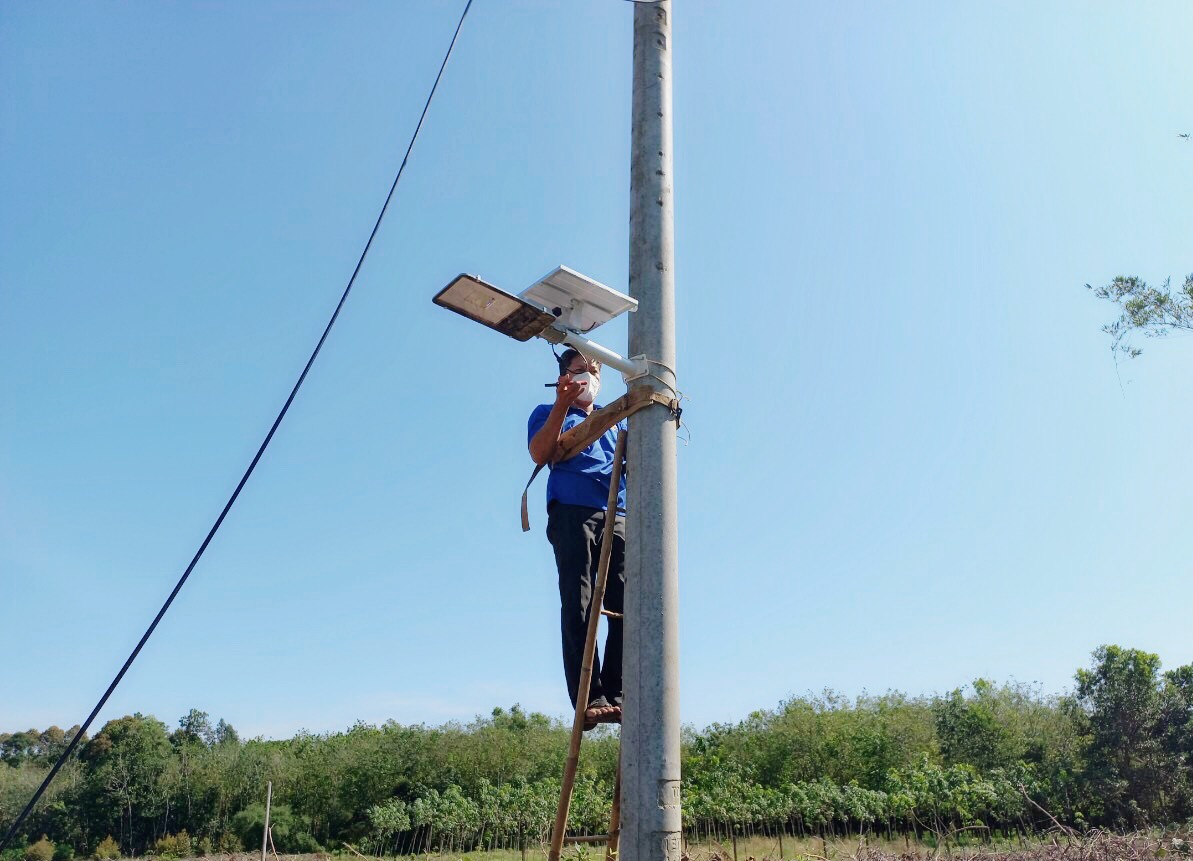 ĐVTN tham gia lắp đặt đèn năng lượng mặt trời tuyến đường trên địa bàn ấp Bến Rộng.