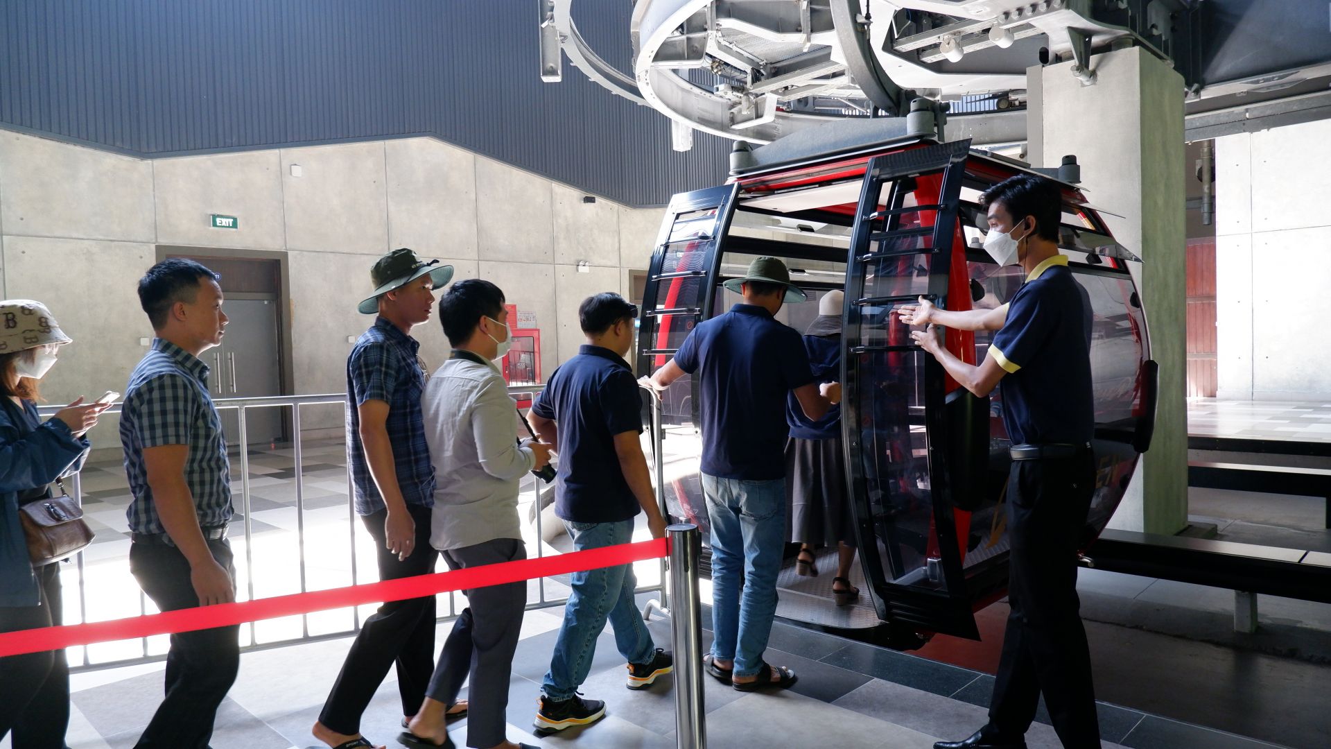 Du khách đi cáp treo lên đỉnh núi Bà Đen.