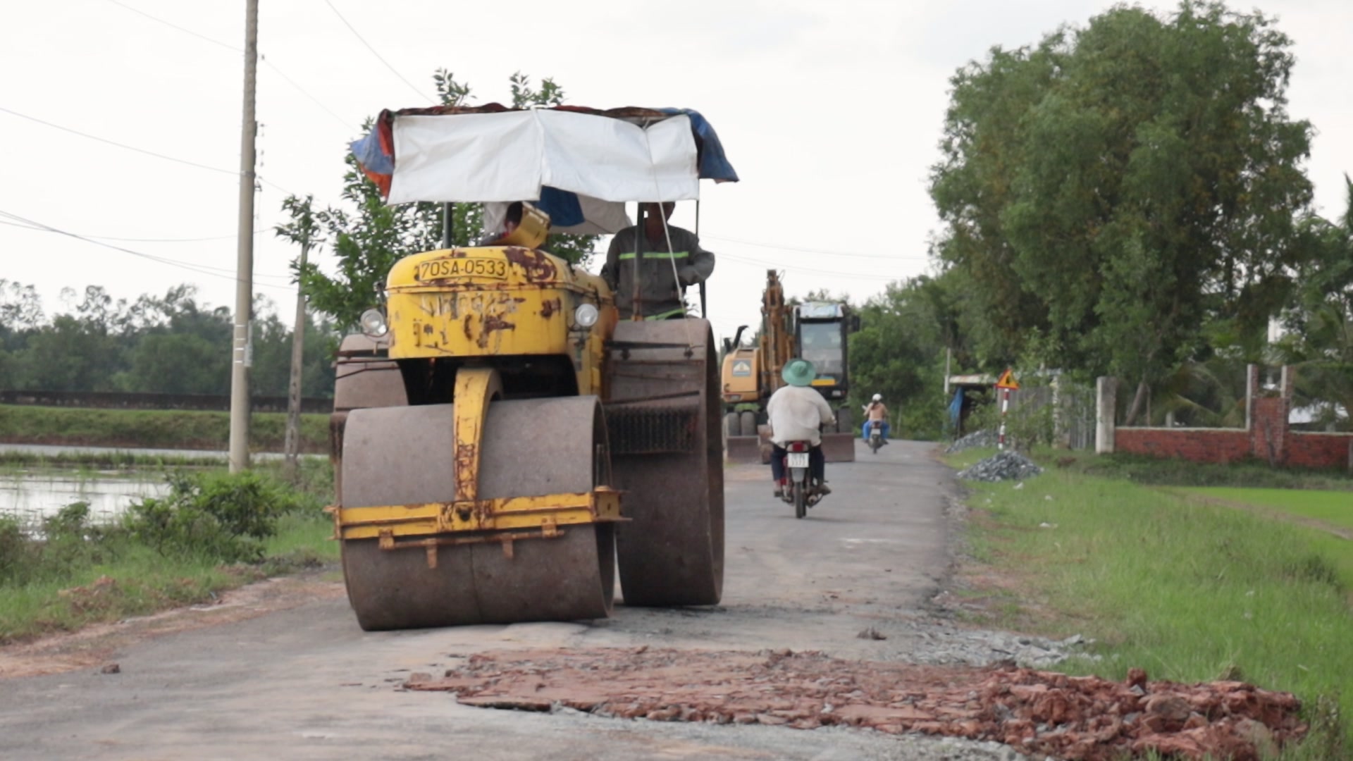 Các loại phương tiện đang sửa chữa những điểm bị hư hỏng trên đường huyện 6B.