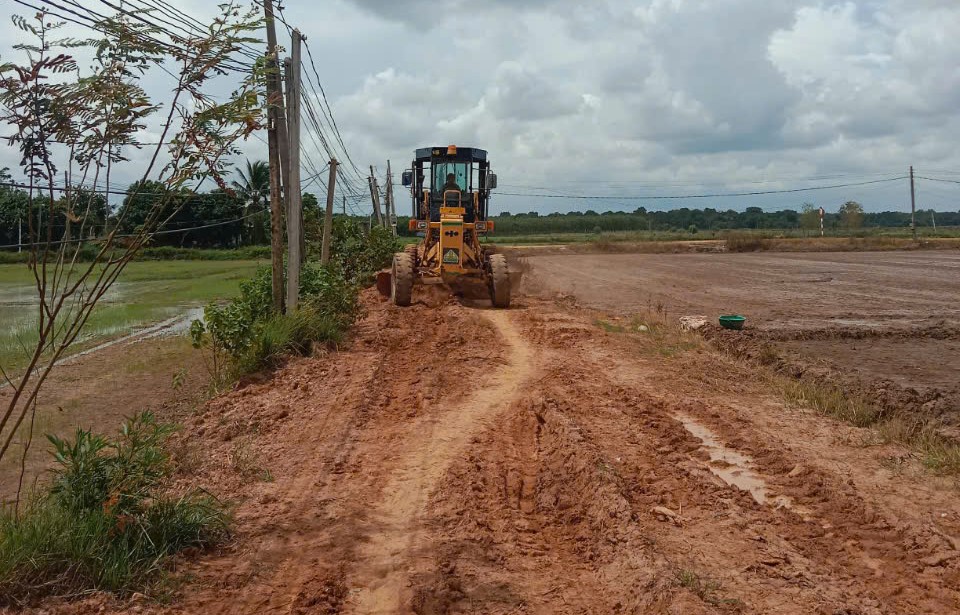 Công ty TNHH Đ.T.H cho xe ban gạt tuyến đường đường đất từ cuối khu dân cư ấp Hoà Hợp đến mỏ khai thác của doanh nghiệp này.