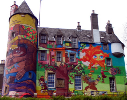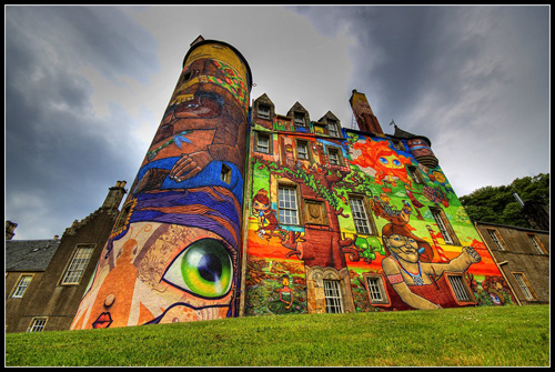Đó là lâu đài Kelburn, có niên đại từ thế kỷ 13, nằm gần thành phố biển Largs, phía tây của Scotland. Nó đã được sơn phủ bằng những hình vẽ graffiti vào năm 2007 bởi nhóm các nghệ sĩ người Brazil.