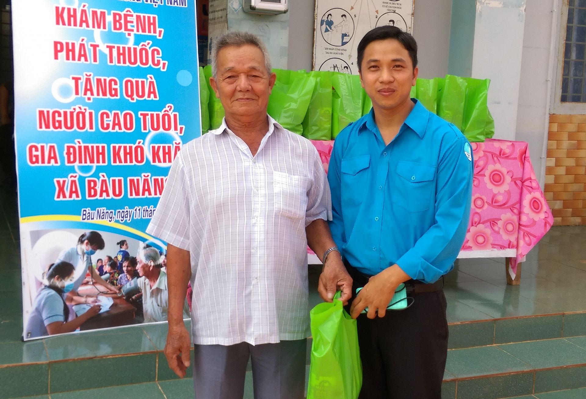 Anh Thạch Cương tặng quà cho người cao tuổi.