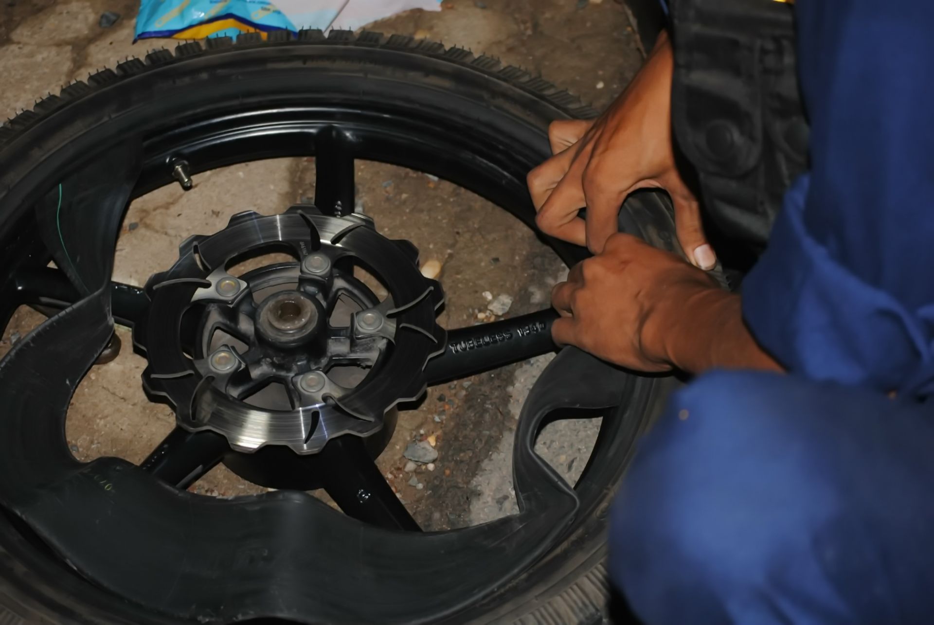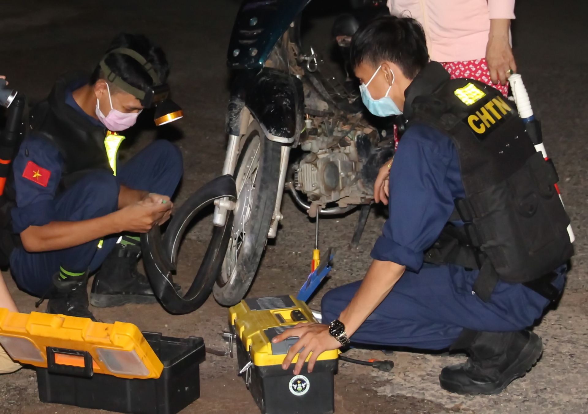 Thành viên Ðội SOS 006 Dương Minh Châu giúp sửa xe cho người đi đường.