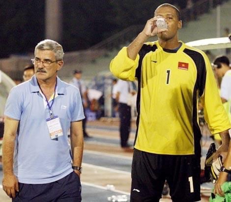 Phan Văn Santos: Santos (phải) là nhân vật đặc biệt ở trận đấu đó khi anh là cầu thủ nhập tịch gốc Brazil. Tuy nhiên, điều khiến anh được nhớ tới nhiều nhất là việc không hát quốc ca Việt Nam. Santos có sự nghiệp thành công ở Việt Nam trong màu áo Đồng Tâm Long An. Khi giải nghệ, anh vẫn gắn bó với Việt Nam, làm nhiều nghề và hiện dạy bóng đá ở trường quốc tế tại TP.HCM. Ảnh: Quang Minh.