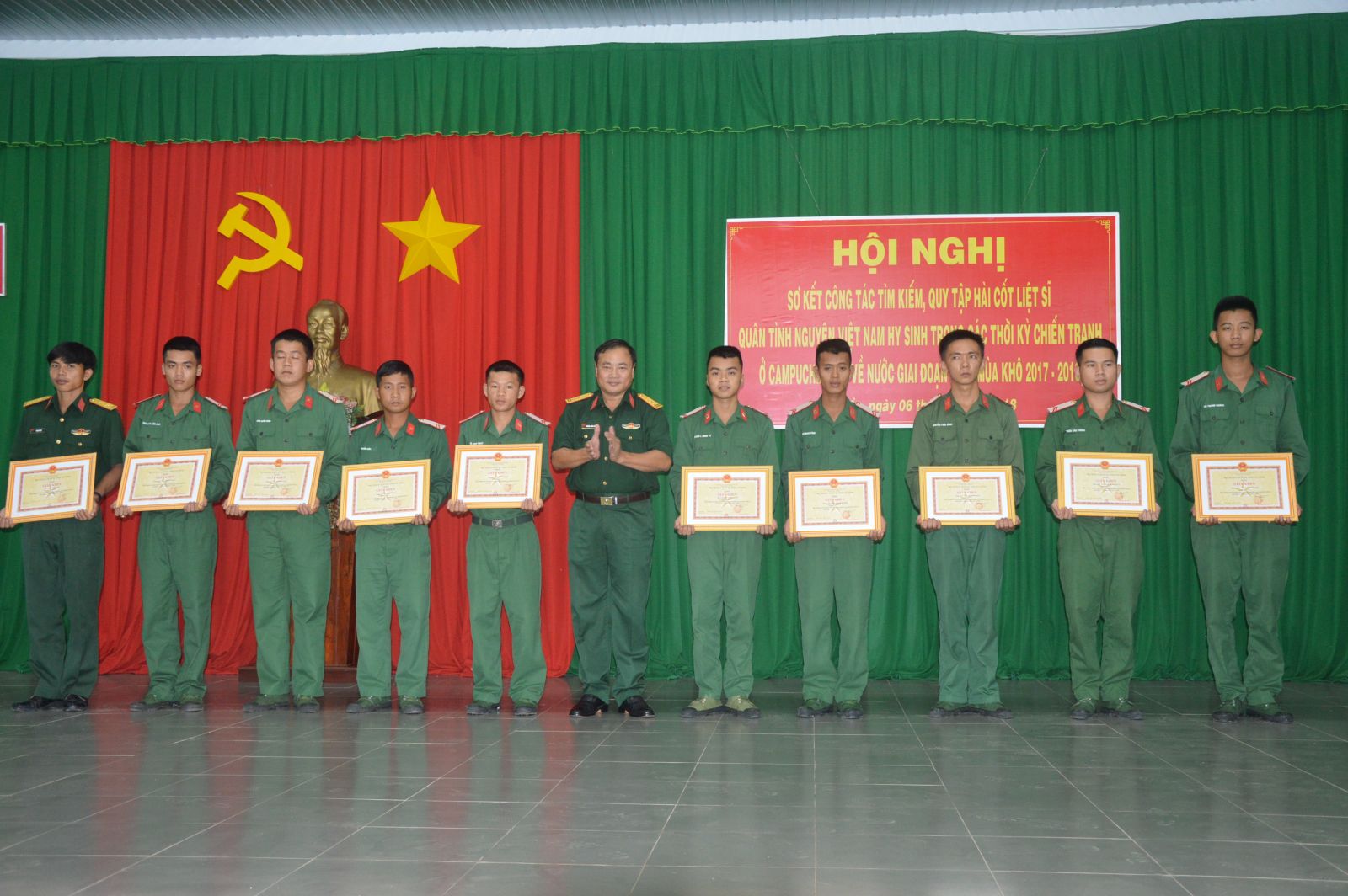 Đại tá Hoàng Xuân Cường- Chính ủy Bộ CHQS tỉnh trao thưởng cho các cá nhân tiêu biểu trong công tác quy tập hài cốt liệt sĩ.