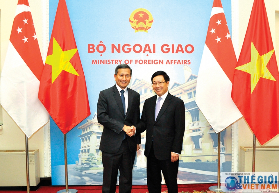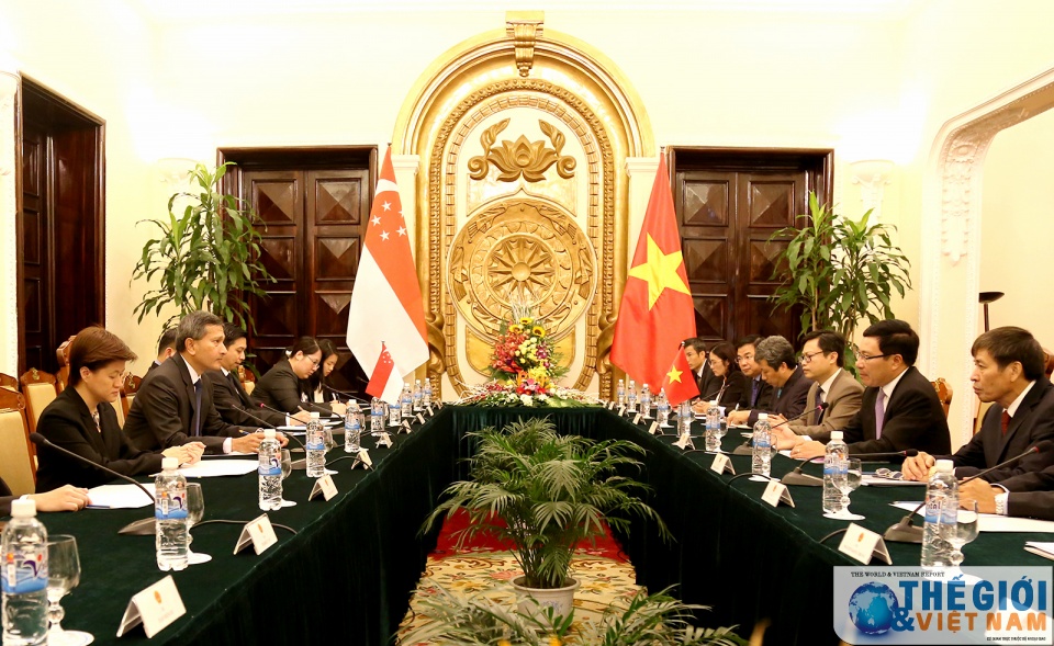 Phó Thủ tướng, Bộ trưởng Ngoại giao Phạm Bình Minh và Bộ trưởng Ngoại giao Singapore Vivian Balakrishnan tại Hà Nội, tháng 10/2016. (ảnh Tuấn Anh)