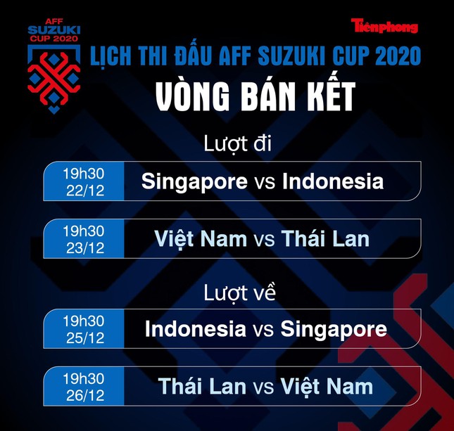 Hai trận bán kết lượt đi, lượt về giữa Việt Nam và Thái Lan sẽ diễn ra vào các ngày 23 và 26/12 vào lúc 19h30.
