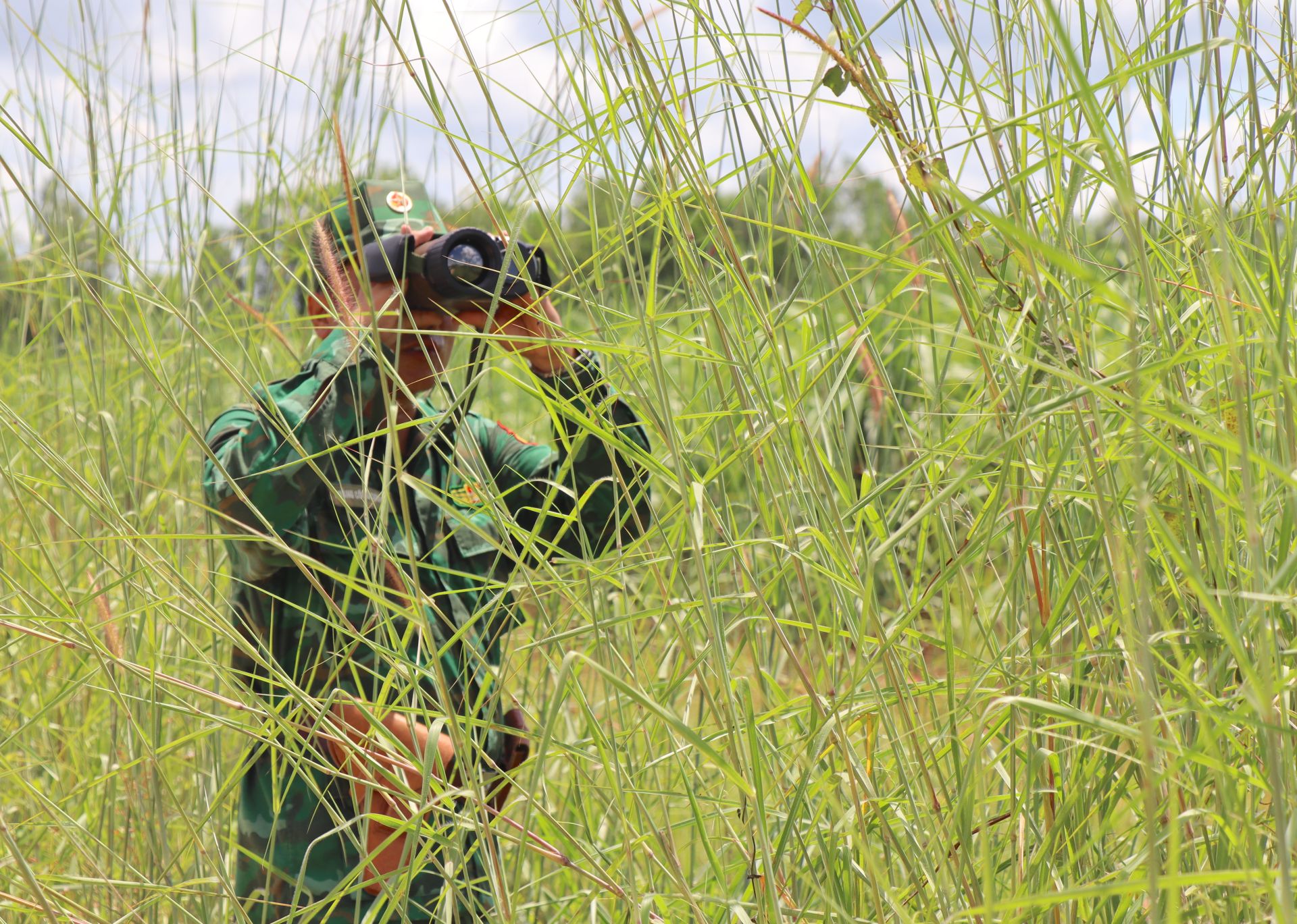 Thiếu tá Hoàng Công Cường, Đội trưởng vũ trang Đồn Biên phòng Cửa khẩu Phước Tân sử dụng ống nhòm trong công tác tuần tra.