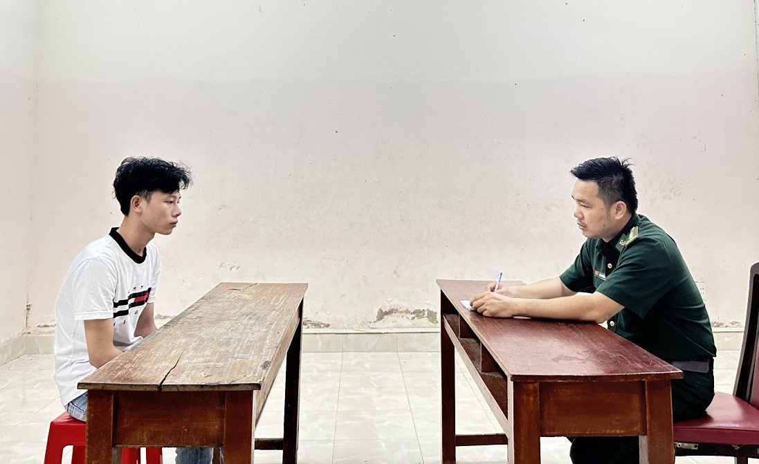 Các chiến sĩ Đồn BPCKQT Mộc Bài lấy lời khai ban đầu đối với Hà Huy Mạnh.
