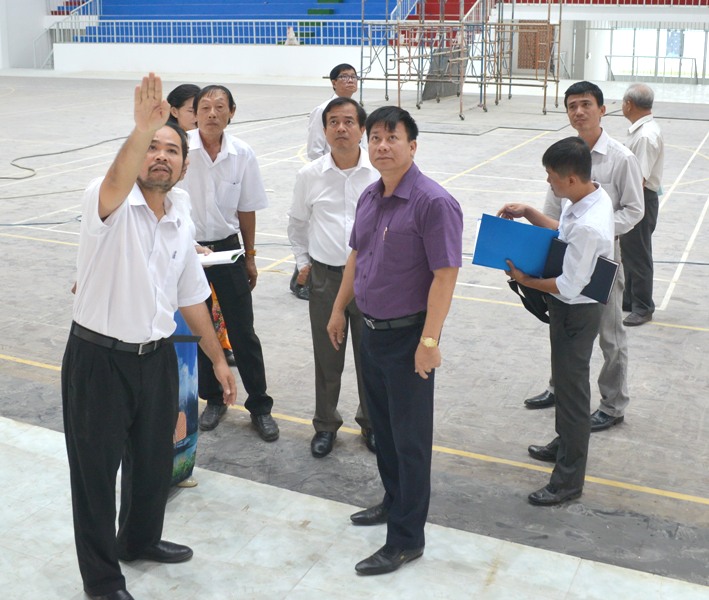 PCT Thường trực UBND tỉnh Nguyễn Thanh Ngọc và lãnh đạo các sở, ngành kiểm tra công trình nâng cấp TT.TĐTT trước khi bàn giao cho BTC Giải bóng chuyền nữ QT - Cúp VTV9 Bình Điền (ảnh: Tuấn Anh)