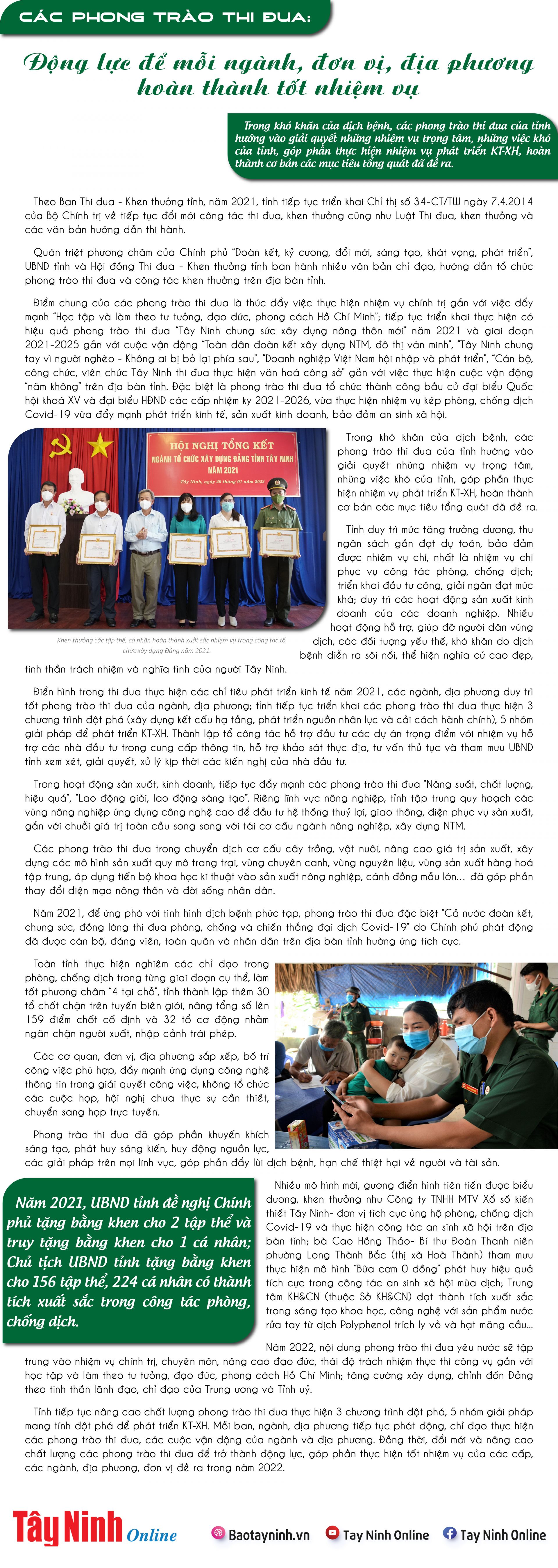Trong khó khăn của dịch bệnh, các phong trào thi đua của tỉnh hướng vào giải quyết những nhiệm vụ trọng tâm, những việc khó của tỉnh, góp phần thực hiện nhiệm vụ phát triển KT-XH, hoàn thành cơ bản các mục tiêu tổng quát đã đề ra. |