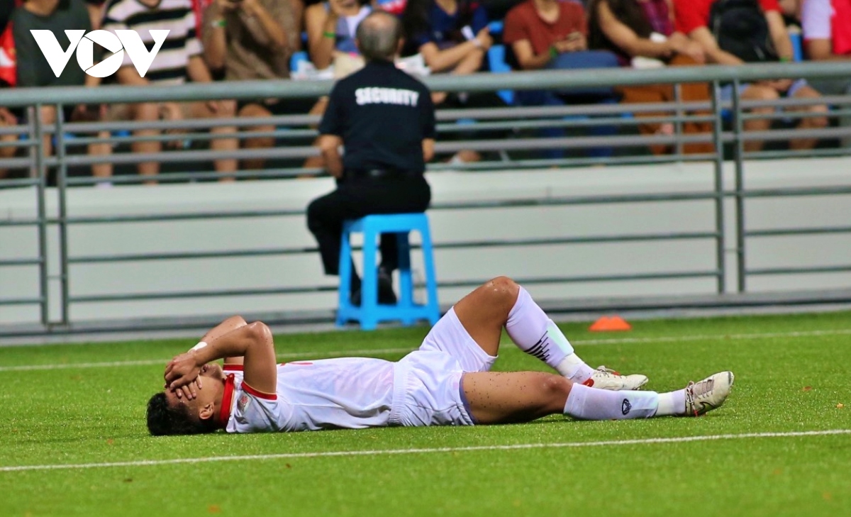 Cầu thủ Việt Nam liên tục nằm sân khi bị Singapore phạm lỗi (Ảnh: Nguyễn Trọng).