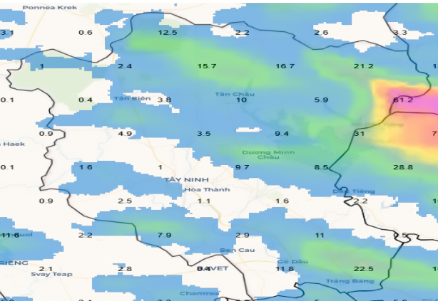 Dự báo từ tối ngày hôm nay (10.6) đến tối ngày 12.6, khu vực các huyện Tân Châu, Dương Minh Châu và thị xã Trảng Bảng có mưa vừa, mưa to và dông. Tổng lượng mưa trong 48 giờ phổ biến khoảng 50-90mm.