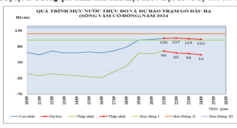 Hiện tại, lưu vực sông Vàm Cỏ Đông tại trạm Thủy văn Gò Dầu Hạ: mực nước ở thượng lưu có xu thế lên cao ở mức trên BĐI (báo động I), ở hạ lưu dao động theo triều cường và chân triều.