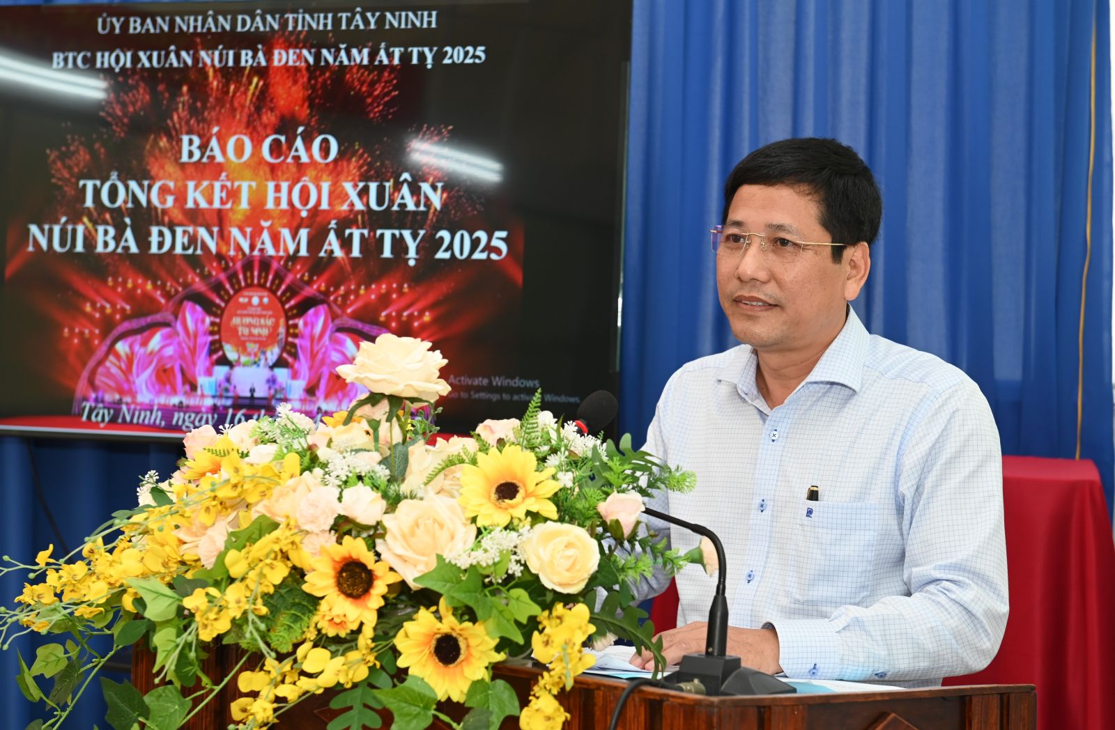 Theo báo cáo, Hội xuân núi Bà Đen năm Ất Tỵ 2025 được sự quan tâm, chỉ đạo của lãnh đạo tỉnh; sự phối hợp đồng bộ, chặt chẽ của các sở, ban, ngành, đơn vị là thành viên Ban tổ chức Hội xuân; cùng với sự hỗ trợ tích cực của nhà đầu tư, doanh nghiệp kinh doanh dịch vụ và của Ban Điều hành hệ thống các chùa Núi Bà Tây Ninh.
