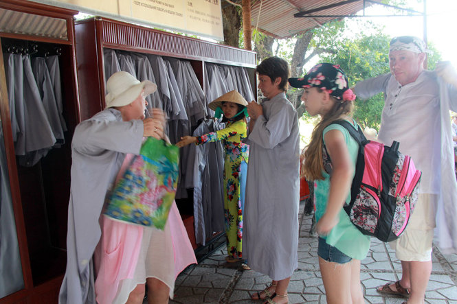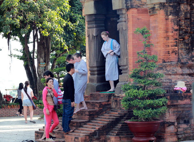 Du khách nước ngoài mặc áo trước khi tham quan tháp bà Ponagar - Ảnh: TR.TÂN