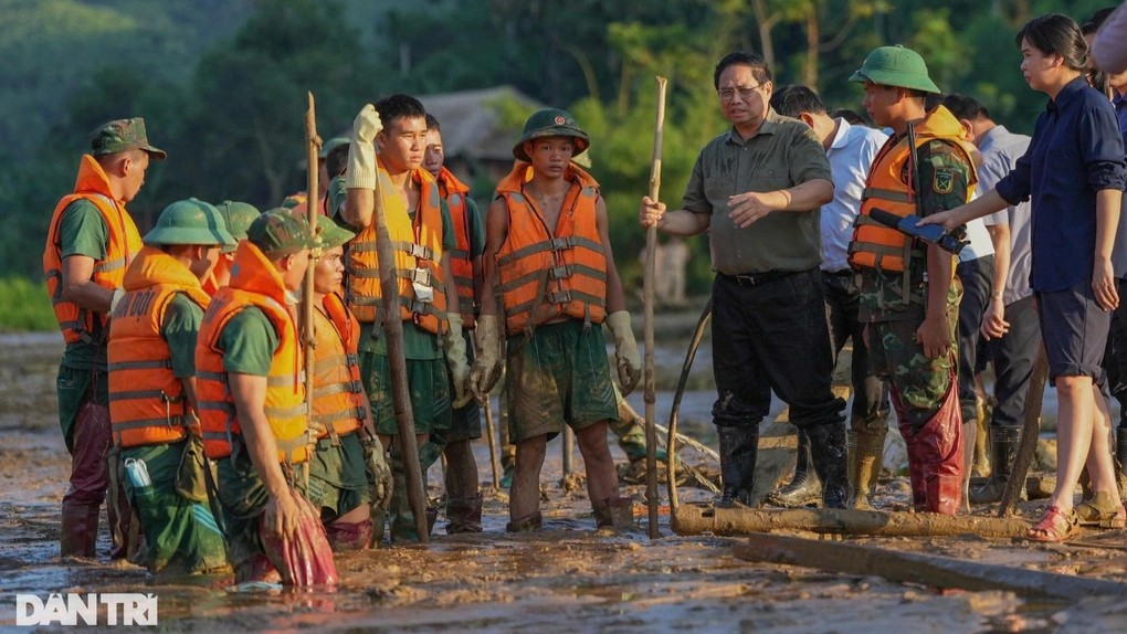 Chiều tối 12/9, Thủ tướng Phạm Minh Chính đến hiện trường vụ lũ quét ở thôn Làng Nủ, chỉ đạo phải tái thiết nơi ở mới cho người dân xong trước 31/12 (Ảnh: Hữu Khoa).