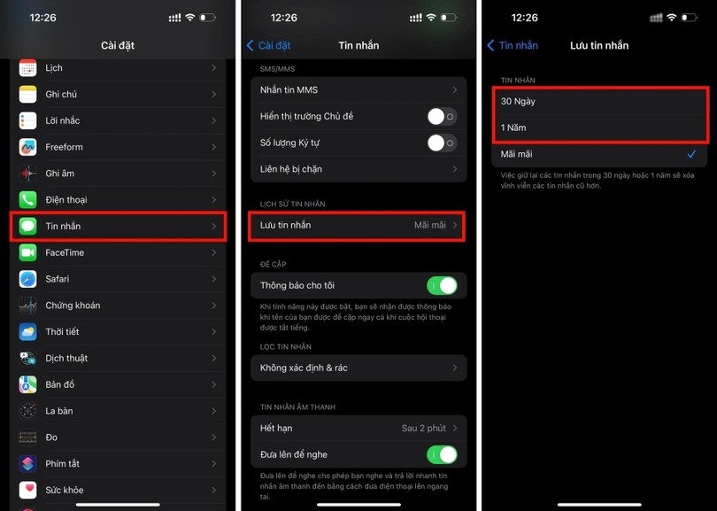 - Bước 3: Chọn thời gian lưu tin nhắn tối đa trước khi ứng dụng tự động xóa chúng (30 ngày hoặc 1 năm).