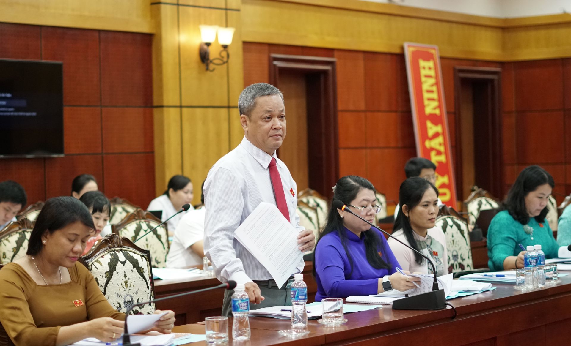 Sau phần trình bày dự thảo nghị quyết của Giám đốc các sở: Kế hoạch và Đầu tư, Nông nghiệp và Phát triển Nông thôn, Tài nguyên và Môi trường, Tài Chính, Phó trưởng Ban Kinh tế - Ngân sách HĐND tỉnh Huỳnh Vương Hiếu trình bày báo cáo thẩm tra các dự thảo nghị quyết và HĐND tỉnh chia 2 tổ thảo luận về các dự thảo nghị quyết trình kỳ họp.