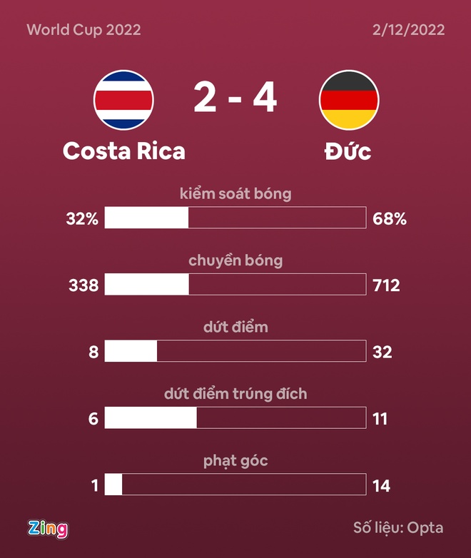 Biến cố trên sân Khalifa dường như khiến tuyển Đức mất tập trung. Đoàn quân của HLV Hansi Flick phòng ngự hời hợt và để thủng lưới sau một tình huống tấn công biên đơn giản. Neuer cản được cú đánh đầu cận thành đầu tiên nhưng bất lực khi Yeltsin Tejeda ập vào đá bồi từ cự ly gần. Tỷ số được cân bằng 1-1 cho Costa Rica, đồng nghĩa với việc Đức bị đẩy xuống cuối bảng với 2 điểm.