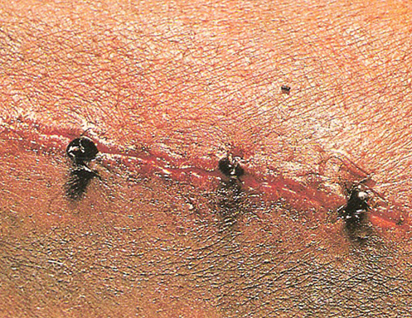 Thời xưa cổ, người ta đặt con kiến lên vết thương để chúng cắn vào hai bên, sau đó bỏ phần thân kiến chỉ giữ lại đầu như chiếc ghim.