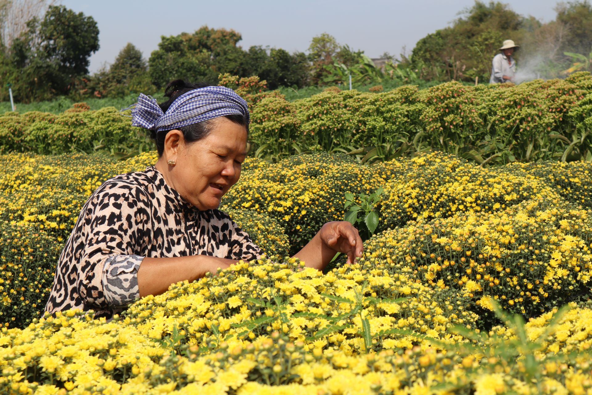 Khả quan hơn so với hai hộ trên, vườn hoa của bà Võ Thị Phụng (sinh năm 1966) cũng nở rộ, đều đẹp hơn so với năm ngoái. Bà Phụng cho biết, bà đã xuống giống gần 20.000 chậu hoa với các loại hoa: cúc tiger, sống đời, vạn thọ, ớt kiểng, màu gà,… Gia đình bà là một trong những số ít hộ trồng được hoa cúc mâm xôi tại Tây Ninh nên trồng được hơn 900 chậu thì đã sớm có thương lái đến đặt cọc hết.
