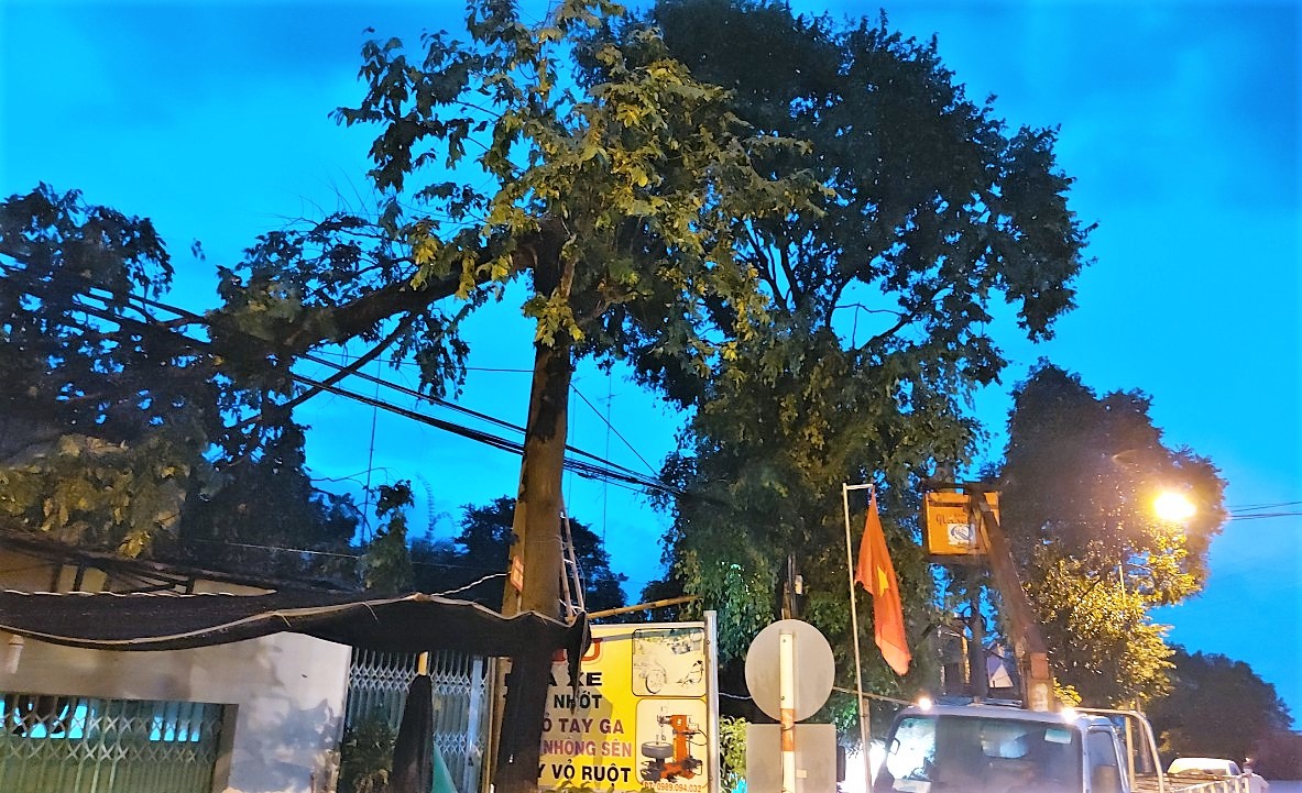 Trên đường ĐT781 (Khu phố 3, thị trấn Dương Minh Châu), hàng loạt cây sao ven đường bị gãy cành, bật gốc, đổ rập vào nhà dân. Có nơi, nhánh cây treo vắt vẻo trên dây điện, cáp viễn thông.